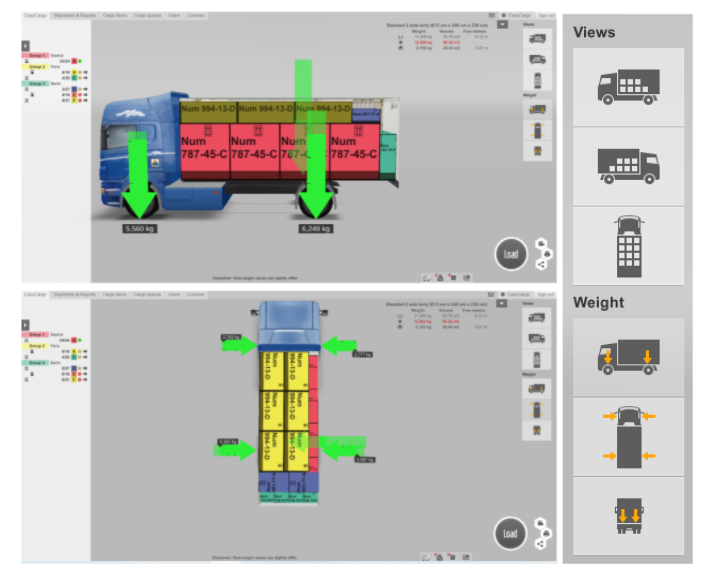Sağ taraftaki panelde, görünümleri değiştirebilir ve yükleme planının ağırlık dağılımıyla ilgili bilgileri görebilirsiniz (bu seçeneği elde etmek için sağ taraftaki paneldeki kargo alanları listesinin daraltılması gerekir):