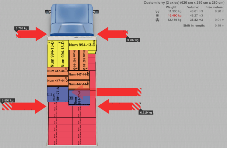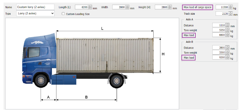 Verilen kargo alanının yanı sıra her aks için ağırlık sınırı, önceden tanımlanmış olanlar kataloğundan gerekli kargo alanlarını seçebileceğiniz, düzenleyebileceğiniz veya yenilerini oluşturabileceğiniz kargo alanları sekmesi altında değiştirilebilir: