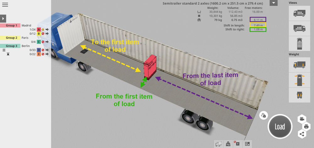Grafikte gösterildiği gibi, mor rakam mevcut yükleme metrelerini gösterir. Sarı rakam uzunlamasına ofseti gösterirken, yeşil rakam metre cinsinden yanal ofseti gösterir.
