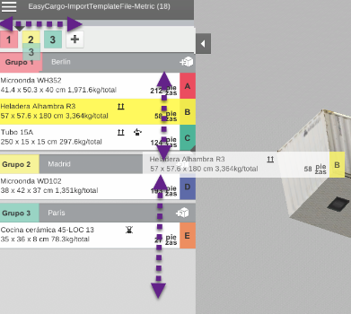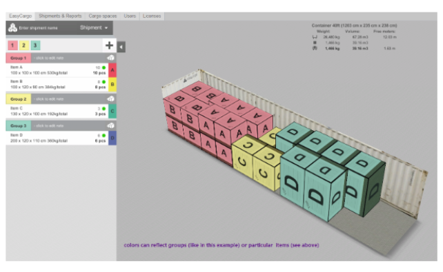 EasyCargo'nun kargo alanının mümkün olduğunca az yer kaplaması için öncelikle eşyaları sırayla boyuna doğru dizdiğini lütfen unutmayın. Bunu önlemek için, malzeme istiflenemez (malzeme türü düzeyinde ayarlar) olarak ayarlayabilir, yükleme planını manuel olarak ayarlayabilir, yükleri gruplara bölebilir ve grupların yığılmasını devre dışı bırakabilirsiniz.